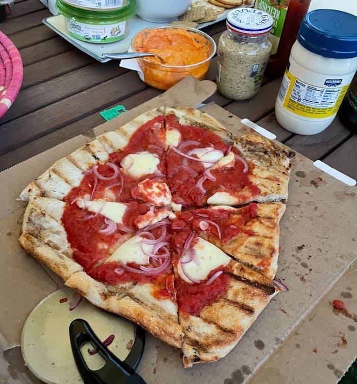 What’s great about this method of grilling pizza is that you don’t take over the real estate of you grill with a pizza stone, so you can cook anything you want before and after pizza time. It’s fun to make pizzas at the end of a grilling session because you can use leftover scraps as toppings. Let your creative juices flow!
