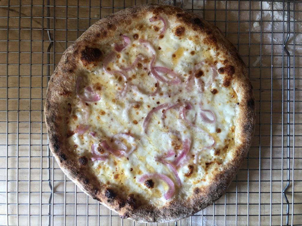 I went with a topping combination of both fresh and low moisture mozzarella, then added some crushed red pepper flakes and pickled red onions. At first, the pizza looked like it was baking just fine. The edge was still pale after two minutes (I was baking in a Breville Pizzaiolo) but I figured the dough was old enough that the sugars would have all been processed by the yeast. I switched the heat distribution to “crust only” and that got me a really nice and even browning.