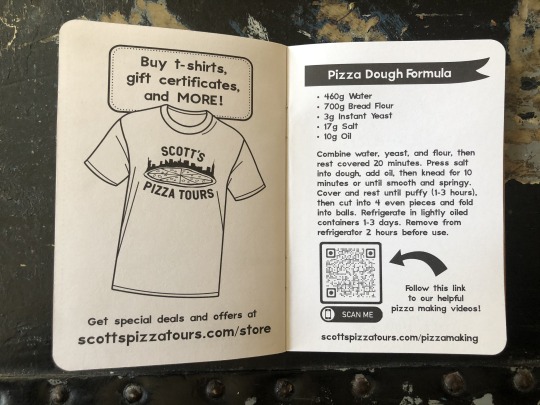 Since we get so many inquiries about SPT t-shirts, we added a page directing guests to a special URL for web store purchases, including shirts, hats, and gift certificates. On the opposite side of the spread, there’s a new version of our pizza dough recipe. Best part is the QR code that will bring guests directly to a hidden page on our web site featuring videos of the pizza making process. Hopefully those videos will help people make better pizza at home.