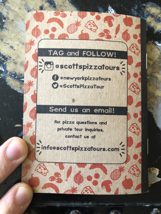 We’ve been working for months with graphic designer/actress Ciara Moriarty on a brand new version of our pocket pizza journal and the fruits of our labor are finally here! Every guest on our NYC pizza tours gets one of these adorable books for tasting notes but we thought it was time to freshen things up. The cover is inspired by the composition pads we used to use in grade school, but with pizza toppings instead of that funny squiggly black and white pattern.